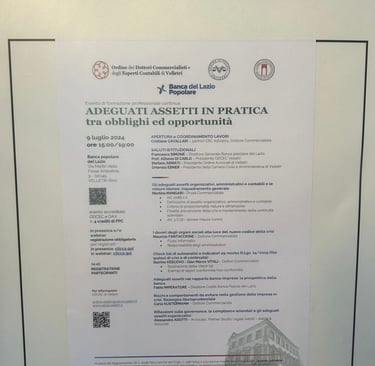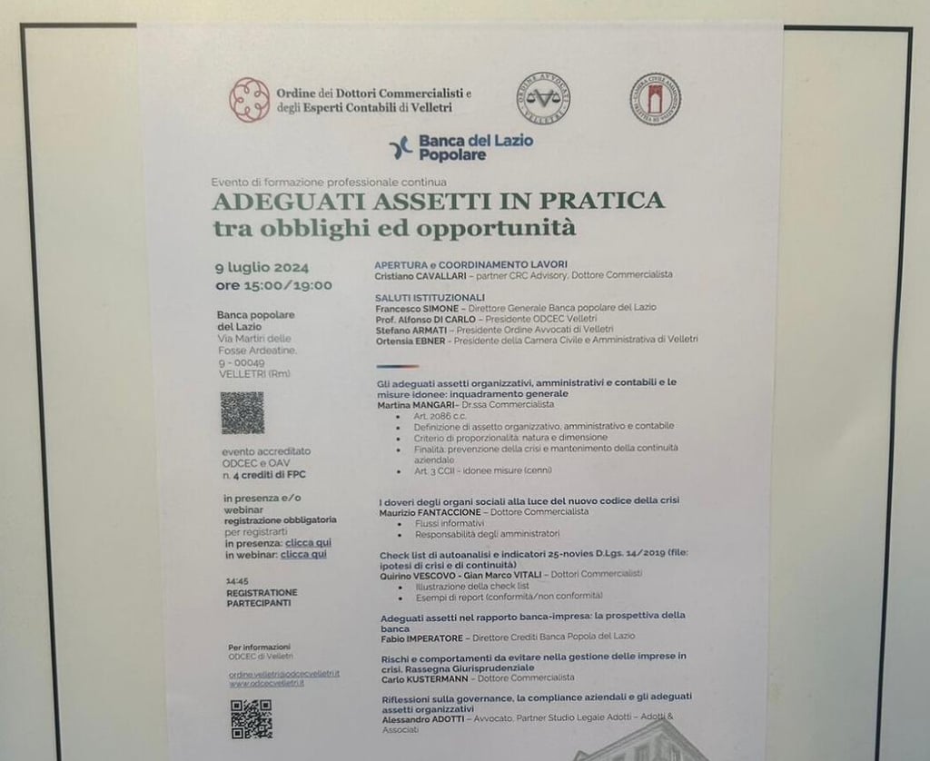 Il 9 luglio 2024 si è svolto, presso la Banca Popolare del Lazio di Velletri, il convegno dal titolo “Adeguati Assetti in pratica: tra obblighi ed opportunità”, organizzato dall’ODCEC Velletri – Ordine dei Dottori Commercialisti e degli Esperti Contabili di Velletri.
